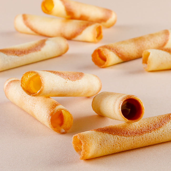 軽やかな口どけのラングドシャ生地にアーモンドペースト入りのミルクチョコレートをくるり。